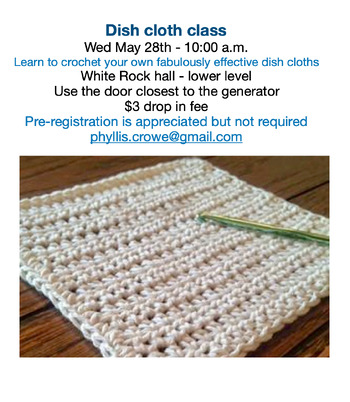 Open to anyone looking for space to bring your projects and work alongside other like-minded people, whether you like to sew, knit, crochet, paint, weave, or whatever. Come & go as you please or bring your lunch & stay all day. Everyone welcome. No sign-up required. Just drop in. NOTE: school cancellation or delay means we are also cancelled. The last Wednesday of each month is an optional Learn-a-New-Skill Day. May 28th we will have a chance to learn how to crochet our own dishcloths. Materials are supplied.