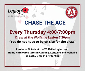 Chance to win 20% of the week's ticket sales plus the weekly climbing jackpot. Draw at 7:30pm. You don't have to be a Legion member to play! All profits will go directly to support Acadia Minor Hockey and the Wolfville Legion. You don't have to be present to play. We will be live streaming each draw.