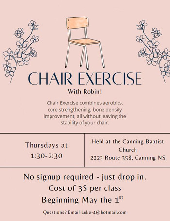 All ages & abilities are welcome. No sign-up required - just drop in. Led by trained instructor Robin Foster. Chair Exercise combines aerobics, core strengthening, bone density improvement, all without leaving the stability of your chair.