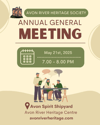 All are welcome to join us in the Avon Spirit Shipyard for the annual general meeting for the Avon River Heritage Society. Together we will catch-up on the ongoing activities taking place at the Avon River Heritage Centre and in the Avon Spirit Shipyard.
