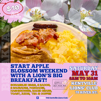 Start your Apple Blossom Weekend with a Lion's BIG BREAKFAST. Scrambled eggs, bacon, sausage, pancakes, hashbrowns, baked beans, toast, juice, tea & coffee. Roar like a Lion with a good breakfast in your tummy!