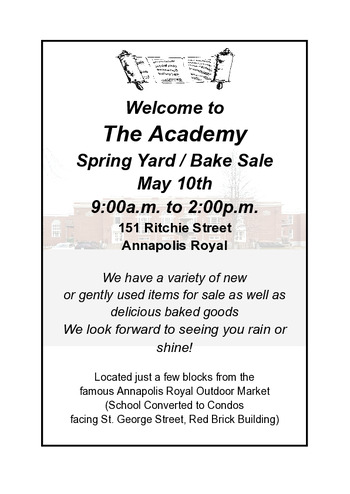Spring Yard / Bake Sale (Large Red Brick building facing St. George St.). Located just up the road from the Annapolis Royal outdoor market.