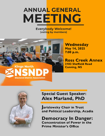 All welcome! Special Guest speaker, Alex Marland, PhD, Jarislowsky Chair in Trust and Political Leadership, Acadia University, will speak on Democracy in Danger: Concentration of Power in the Prime Minister's Office, following a short meeting and election of officers.