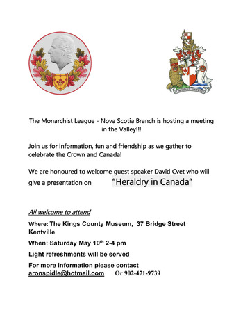 The Monarchist League - Nova Scotia Branch is hosting a meeting in the Valley!!!