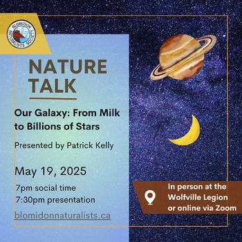 Speaker Patrick Kelly will present the Blomidon Naturalists Nature Talk this month on Our Galaxy: From Milk to Billions of Stars. The Milky Way was a mysterious band of white light that arched across the sky for most of human history. Galileo revolutionized the scientific understanding of the galaxy and our place in it in 1610, launching the modern journey of exploration and understanding of the heavens. This talk will consider highlights on this journey including the debate about the nature of “island universes” that was not settled until 1924. From there, we’ll consider how our perspectives of the galaxy have further evolved and what the future might hold.