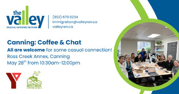 The Valley REN's Annapolis Valley Welcome Network is hosting a Coffee & Chats! These Coffee & Chats are the perfect opportunity for newcomers to meet with community, local service providers, and each other during a casual, free meet and greet. Along with YREACH, we invite everyone to come on out, meet someone new, share about the Annapolis Valley, and get to know your neighbours!