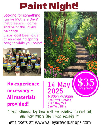 A paint night for nature lovers! Come and paint this lovely green garden path scene, in the cosy Sea Level Brewing taproom.