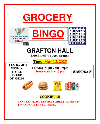 7 games of grocery bingo, each bag valued at $25 with the jackpot bag valued at $50. A special game played for a $40 gift card. 50/50 ticket draw. Full canteen with hamburgers & hot dogs. Cookie jar.
