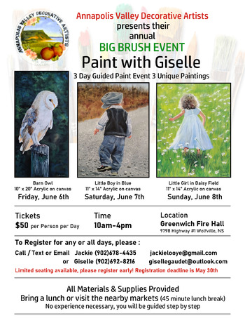 3 days, 3 paintings! Guided instructions and all supplies provided. Bring a lunch or visit nearby markets. Pick a day, 2 or all three...Register by June4th. No Experience Needed!