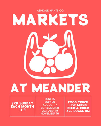 Shop and support small, local businesses at our seasonal outdoor Markets at Meander! Craft beer, cider, farmers, artisans, bakers, food truck, and live music make this event at Meander River Farm & Brewery one you won’t want to miss. Grab your family and friends and join us: