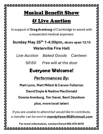 Join us for an exciting afternoon of music and a live auction in support of Greg Arenburg of Cambridge. We have an exciting line up of entertainers including Matt Lunn, Matt Millet & Carson Fullerton, David Doyle & Nadine MacDonald, David Arenburg, Donnie Arenburg, Tim Gavel & Basil Davidson plus more local talent!