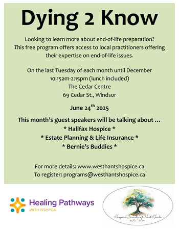 On the last Tuesday of each month, from March 27th to December 30th, 'Dying 2 Know' is a monthly in-person seminar offered to community members with the intent to provide contacts, information and education from various end-of-life practitioners and clinicians. The ideal participant is one who is seeking to learn more and to prepare for end-of-life.