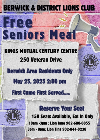 Berwick & District Lions Club is offering a FREE 60+ meal to all Berwick residents. Call to receive your seat 902-844-0238.