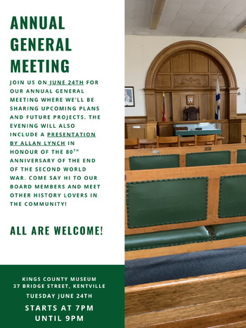 Our Annual Meeting where we discuss the previous year, as well as the year ahead for the Kings County Museum. Board members and staff will be present and we will have having a guest speaker give a presentation to the community after everyone gets settled. We look forward to the opportunity to reach out and become familiar with the people of King's County and create positive connections with the community.