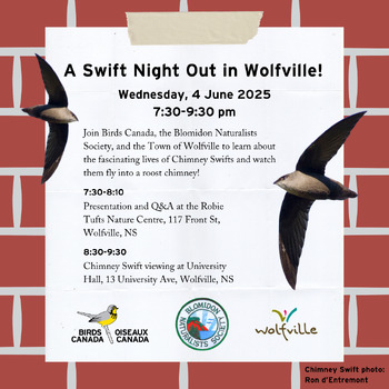 Join Birds Canada, the Blomidon Naturalists Society, and the Town of Wolfville to learn about the fascinating lives of Chimney Swifts! After the presentation, we will walk to Acadia's University Hall to wait for the Chimney Swifts to fly into the roost chimney.
