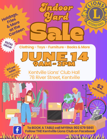 BACK AGAIN! The Lions' successful Indoor Yard Sale is back. Lots of treasures to be found! New and used items: crafts, jewelry and household items. Full canteen available and 50/50 draw.