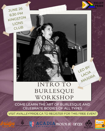If you’ve ever been mesmerized by a burlesque artist and wanted to try it out, now’s your chance! Halifax burlesque legend, Lacia Majora is coming to the Valley to teach you how to shimmy and strut.