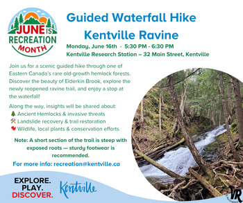 Join us for a scenic guided hike through the Kentville Ravine, home to one of Eastern Canada's stunning old growth forests. Discover the beauty of Elderkin Brook, explore the newly reopened ravine trail, and enjoy a stop at the waterfall!