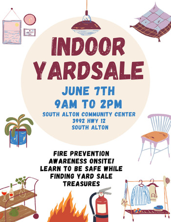 Join South Alton Community Centre in a indoor Yardsale along with a Wildfire Awareness. Its that time of year for us to be aware and how to prevent wildfires and what to do in one .