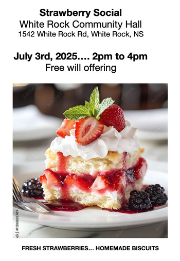 Strawberry Social with fresh strawberries, homemade biscuits, and fresh whipped cream. Free will offering only.