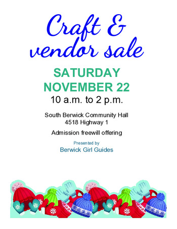 Berwick Girl Guides host a craft and vendors sale. Freewill offering admission, Girl Guide cookies for sale, and fun tables of goodies from our favourite crafters and vendors. Event info: contact Sara, [email protected]
