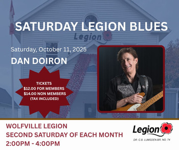 Saturday Legion Blues featuring Dan Doiron. Only 85 tickets being sold. Advanced tickets available at the Wolfville Legion Admin Office or call 902-542-5869.