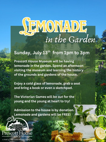 Prescott House Museum will be having lemonade in the garden. Spend an afternoon visiting the museum and learning the history of the grounds and gardens of the house.
