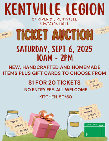 Here's another event you'll want to put in your calendar - Kentville Legion Ticket Auction. The kitchen will be open so come for lunch or a snack and try your luck to treat yourself or a gift for someone special! All welcome, all ages.