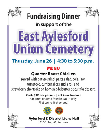 Come on down and enjoy a delicious meal with all the fixings, Dessert and includes your support to an amazing cause, The East Aylesford Union Cemetery.