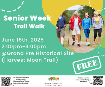 Join Municipality of Kings staff for a Senior's Walk and Talk. The group will meet at the Grand Pre Historic Site parking lot and will then go on a 30-40 minute walk on the Harvest Moon Trail.