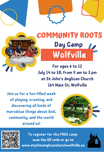 PRE-REGISTRATION IS REQUIRED: https://www.stjohnsanglicanchurchwolfville.ca/community-roots-day-camp.html