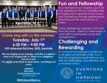 We sing every Tuesday, all summer, which is the perfect time to try singing with us. There is no obligation other than to have fun!