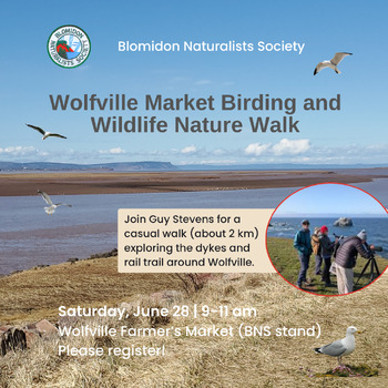 Visit our Blomidon Naturalists Society's booth at the Wolfville Farmers' Market and join Vice President Guy Stevens for a casual walk (about 2 km) exploring the dykes and rail trail around Wolfville. This is a great way to combine nature, shopping and socialising. Open to all nature lovers. Bring your binoculars if you have them. Walks are at 9 am and at 10:30 am.