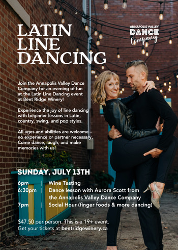 Join Annapolis Valley Dance Company for an evening of fun at the Latin Line Dancing in the Vines event at Bent Ridge Winery! Experience the joy of line dancing with beginner lessons in Latin, country, swing, and pop styles. All ages and abilities are welcome—no experience or partner necessary. Come dance, laugh, and make memories with us!