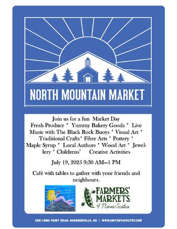 Join us as we welcome our community of food and artisan vendors to the beautiful hamlet of Habourville. Come and spend the day on the Bay of Fundy! Our market is just up the hill from the harbour in our historic little wooden church on the bluff. Live Music with The Black Rock Buoys, Creation Station for the kids.