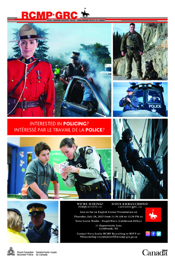 The Royal Canadian Mounted Police (RCMP) will be hosting two in-person career information sessions for individuals interested in pursuing a meaningful and rewarding career in policing. These sessions are designed to provide insight into the RCMP application process, training, career paths, and the unique experiences of serving in a national police service.
