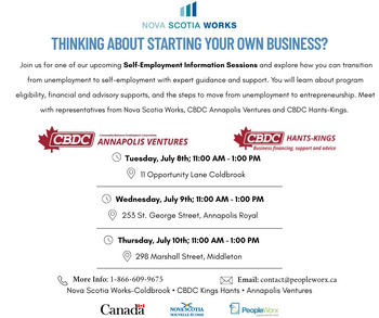 Nova Scotia Works – Middleton, in partnership with CBDC Annapolis Ventures invites individuals interested in entrepreneurship to attend an upcoming Self-Employment Program Information Session. This free session will provide valuable insights into the program's eligibility requirements, financial and advisory supports, and the steps involved in transitioning from unemployment to self-employment. Attendees will have the opportunity to engage directly with representatives from both CBDC and Nova Scotia Works, ask questions, and learn more about the resources available to help launch and sustain a successful small business. No registration is required, and all job seekers, aspiring entrepreneurs, and those curious about self-employment are encouraged to attend.