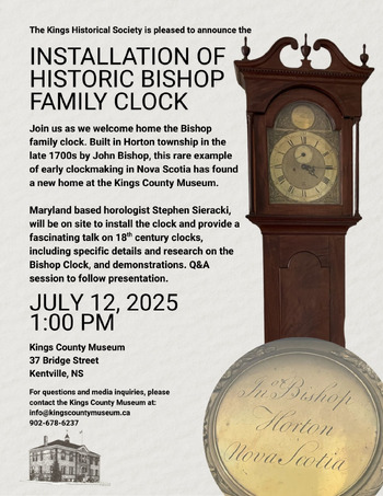 On July 12th, 2025, the clock will be installed in a permanent exhibit which will pay tribute to the Bishiop family, the Bishop family clock, and the planter legacy of Kings County. This installation will include reinstalling the Bishop Clock mechanisms (which will have been removed for safe transport). Stephan Sieracki will also be giving a talk on 18th-century clocks, including specific details and research on the Bishop Clock, and demonstrations. Q&A session to follow presentation.