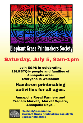 To celebrate, honour, and respect 2SLGBTQI+ people and families in the Annapolis area, join Elephant Grass Printmakers for hands-on printing fun in two locations on Saturday, July 5.