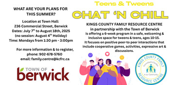 What are your plans for summer? Teens & Tweens Chat 'N Chill. Kings County Family Resources Centre in partnership with the Town of Berwick is offering a 6-week program in a safe, welcoming & inclusive space for tweens & teens, ages 10-15. It focuses on positive peer-to peer interactions that include cooperative games, activities, expressive art & discussions.
