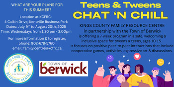 What are your plans for summer? Teens & Tweens Chat 'N Chill. Kings County Family Resources Centre in partnership with the Town of Berwick is offering a 6-week program in a safe, welcoming & inclusive space for tweens & teens, ages 10-15. It focuses on positive peer-to peer interactions that include cooperative games, activities, expressive art & discussions.