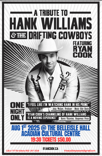 This is going to be a wonderful, old fashioned, country concert . You'll think you went back in time, listening to Hank Williams. Ryan is an excellent musician and he will be joined by his band, "The Drifting Cowboys". It will certainly be a night to remember.