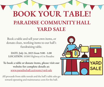 To book your table or donate items, please contact us at [email protected] or visit our website (https://paradisehall.ca/events/yard-sale) and complete our "Book at Table" form.