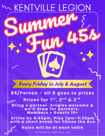 The Kentville Legion will be hosting fun and friendly games of 45s! So, plan to come out for 45's, socializing, cold beverages, prizes (for 1st, 2nd & 3rd place teams) and FUN!