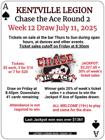 Get your Chase the Ace tickets for a chance to win 20% of the week's sales plus a chance to win the Jackpot which will be $2,327 + 30% of week's sales!