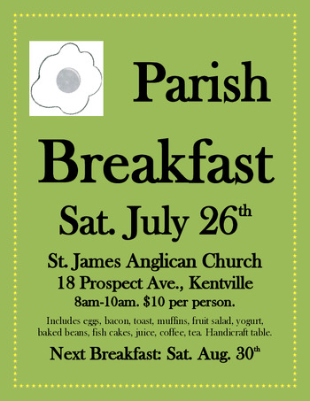 Includes eggs, bacon, toast, muffins, fruit salad, yogurt, baked beans, fish cakes, juice, coffee, tea. Handicraft table.