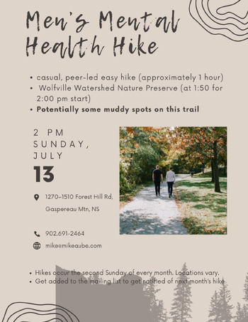 This is a casual, peer-led easy walk where men will gather for camaraderie, time in nature and informal support. We will meet at Wolfville Watershed Nature Preserve (east end of Forest Hill Rd, Gaspereau Mtn) at 1:50 for a 2:00 pm sharp start.