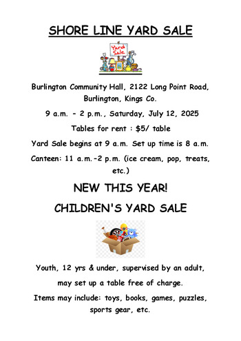 The Shoreline Yardsale that runs from Morden to Halls Harbour, includes Burlington, Kings County where tables are for rent and there will be a canteen with ice cream, cold drinks and treats.