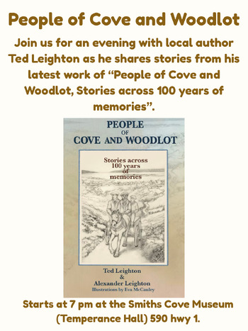 Spend an evening with local author Ted Leighton as he shares stories from his latest work: "People of Cove and Woodlot - Stories across one hundred years of memories" hosted by the Smith's Cove Historical Society in Smith's Cove
