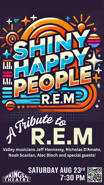 King’s Theatre is pleased to present valley musicians Jeff Hennessy, Nicholas D’Amato, Noah Scanlan, Alec Bloch and some special guests in an authentic tribute to R.E.M. that will please both die hard fans and those who only know the hits! Intricate guitar parts, ghostly vocals, driving melodic bass lines, weird and wonderful lyrics…you won’t want to miss this and hear about it later!